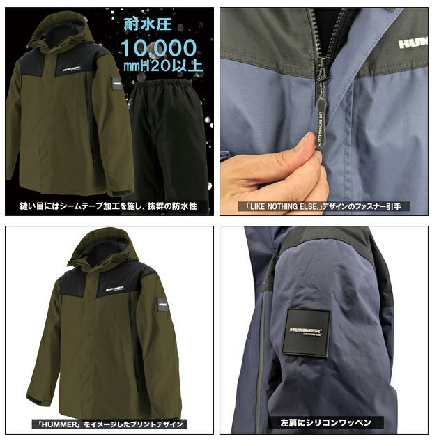 | 【特徴】 | SUVブランドの「HUMMER」をイメージした防水防寒レインレインスーツ。 どこまでも走破できるような、強靭で機動的な車体をモチーフにした唯一無二のデザイン。 【上着】 ・「HUMMER」をイメージしたプリントデザイン ・左肩に「HUMMER」ロゴのシリコンワッペン ・「HUMMER」ロゴ入りの裏地 ・「LIKE NOTHING ELSE.」デザインのファスナー引手 ・止水ファスナーポケット(右×1、左×1)(フリース裏) ・水の浸入を防ぐ袖口調節のフラップテープ ・左右首元にフード調節が可能なドローコード ・裾の左側に調節用のドローコードを装備 【パンツ※各色共通】 ・ウエストコード仕様 |