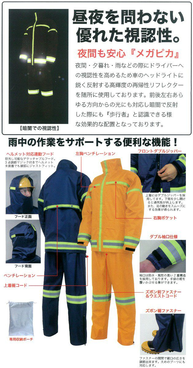 | 特徴 | ・ヘルメット対応連動フード ・ベンチレーション ・上着裾コード ・専用収納ポーチ ・左胸ベンチレーション ・フロントダブルジッパー ・右胸ポケット ・ダブル袖口仕様 ・ズボン前ファスナー&ウエストコード ・ズボン裾ファスナー |