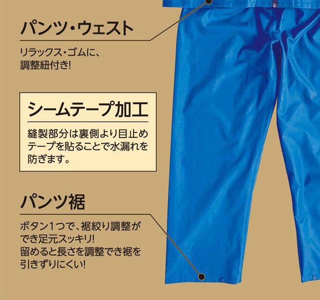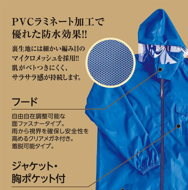 | 特徴 | ◆PVCラミネート加工で優れた防水効果! 裏生地には細かい網目のマイクロメッシュを採用! 肌がベトつきにくく、サラサラ感が持続します。 ◆自由自在調節可能なマジックテープタイプ 雨から視界を確保し安全性を高めるように部分的にクリアな素材を採用 脱着可能タイプです。 ◆縫い目は水漏れを防ぐシームテープ採用 ◆胸ポケット付き ◆ウエストゴムに調節ヒモ付きで調節しやすい ◆パンツ裾はボタン一つで調節可能 |