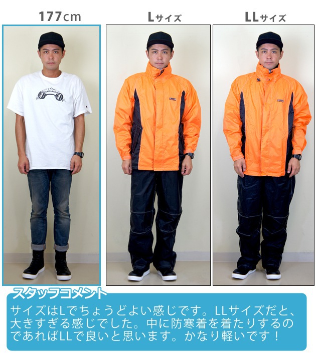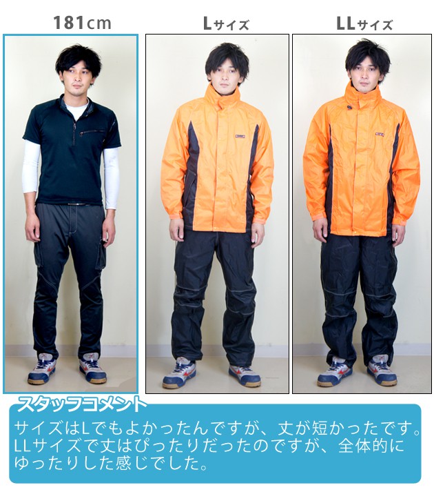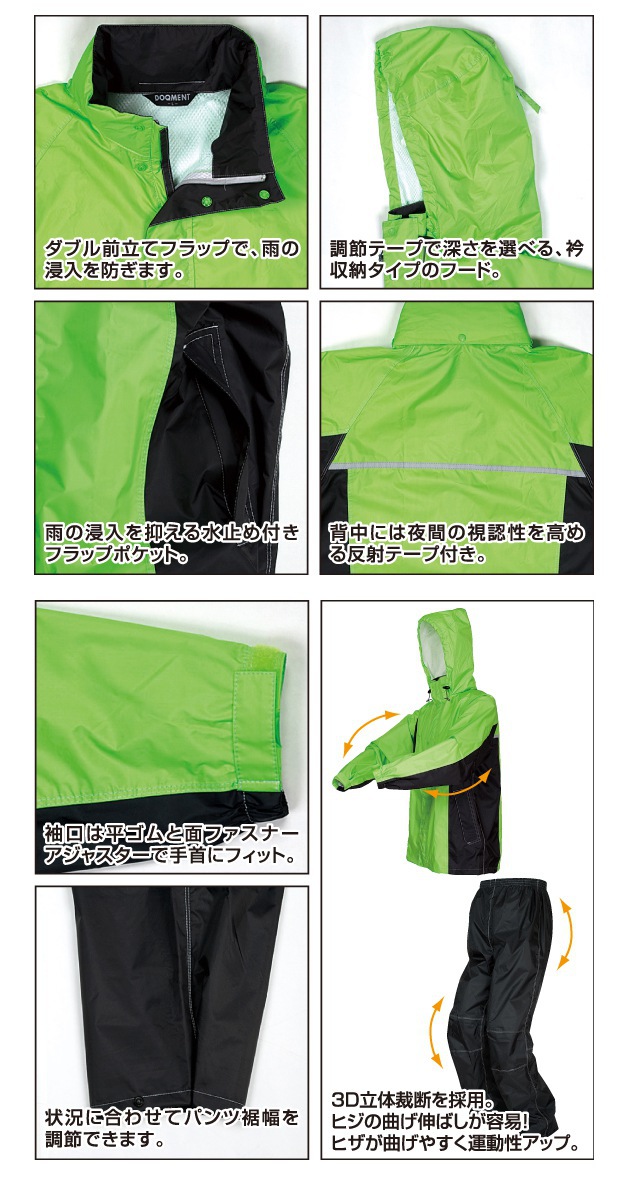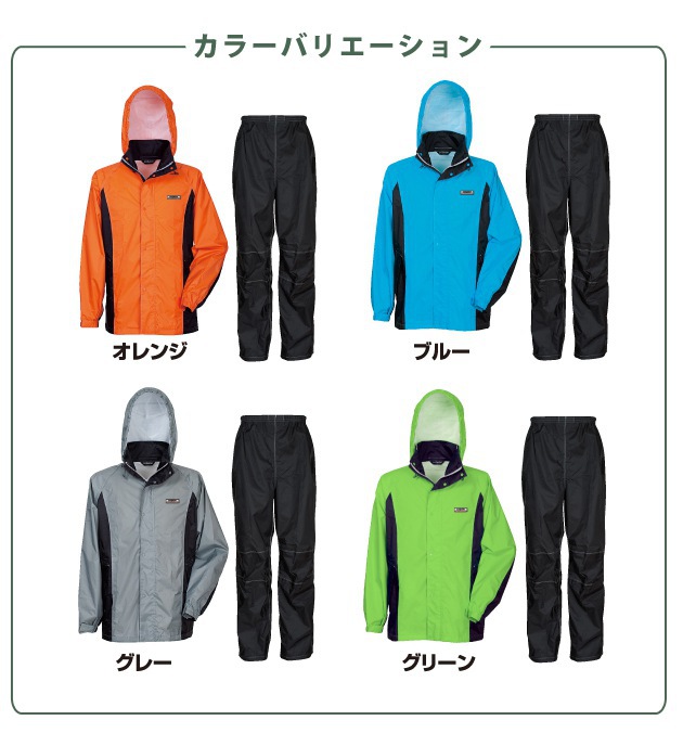 | 特長 | 動きやすくて、ムレにくい! ■ひじや膝の動きやすさを考慮した3D立体縫製を採用! ■ムレを緩和する透湿防水素材を使用 ■さらに総裏メッシュでベタつきを軽減! ■袖は面ファスナーで調節可能 ■ズボンの裾はボタンで絞ることが可能 ■前立ての下側には雨の浸入を防ぐ水返しを採用 ■フードは調節テープで深さを選べ、さらに収納可能 ■雨の浸入を抑える水止め付きフラップポケット ■夜間も安心の反射テープを背中に採用 ■耐水圧10,000mm/透湿度3000g/m2 ■収納袋無し |