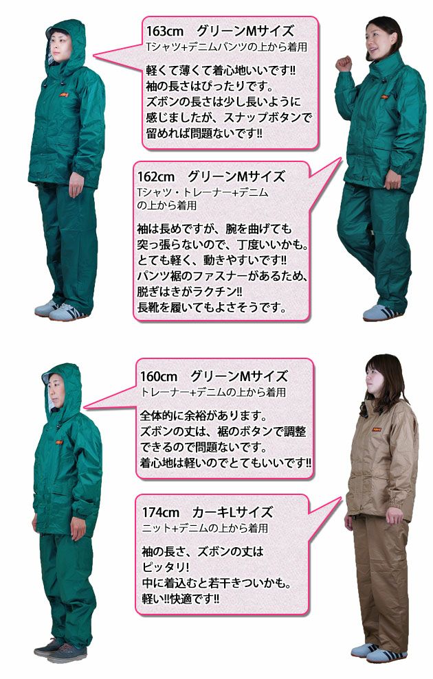 梅雨が明けてしまい、猛暑の中試しに外で着用(笑)サウナスーツに成るかと思いましたが、意外にさっぱり同時に購入したレインキャプの方が汗だく。170㎝75㎏で上は丁度下はややきつく裾丈は丁度でした、靴を履いたまま脱ぎ履き出来る裾ファスナーもう少し長ければベスト、破らないよう大切に使いたいと思います。
