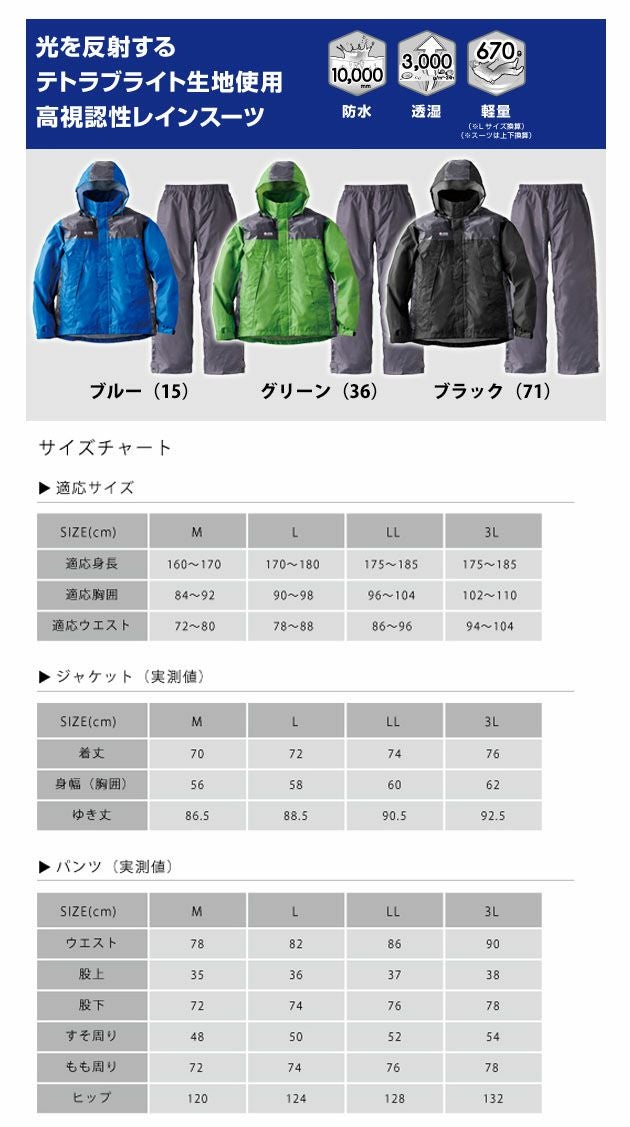 | 特徴 | 夜間も安心。テトラブライト生地使用の高視認性レインウェア。 再帰反射プリントが施されたテトラプライト生地を肩、脇、パンツ脇に使用。 夜間、車のライト等を反射し、高い視認性・安全性を確保します。 モーションガゼット搭載で、動きやすさ、快適さも兼ね備えています。 ■メッシュ裏地 ■ジャケット両脇ベルクロ式ポケット ■収納袋付き ■格納式フード ■アジャスト袖 透湿度3,000g/m2・24h |
