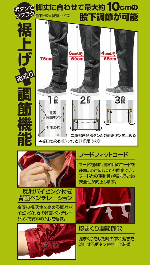 | 特徴 | あなたサイズに足元ピッタリ! 裾上げ調節ができる! しかも軽くてムレない!透湿防水レインスーツ登場! ■脚丈に合わせて最大10cmの股下調節が可能! パンツ裾のボタンで3段階に丈を調節可能! ■ムレは逃がして、雨の浸入を防ぐ! 不快感を軽減!ムレを逃して雨からしっかり守る!耐水圧10,000mm・透湿度5,000g/m2・24hrを実現! ■スーパーフィットコード フード内側に調節用のコードを装着。あごにしっかり固定でき、フードとの連動性が高まるから安全! ■反射パイピング付き背中ベンチレーション 夜間の視認性を高める反射材を背面に。さらに、背中のベンチレーションでムレを逃がします! ■腕まくり調節戒能 腕まくりをした時のずれ落ちを防止するボタンを袖口に装備 ■水の浸入を防ぐシームテープ加工 ■総裏メッシュでベタつき軽減! ■収納袋付き |
