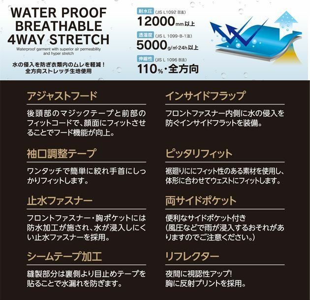| 特徴 | 雨の日も晴れの日も、さぁ外へ行こう! 全天候型次世代ストレッチレインウェア登場! ◆タテヨコ斜めに自由に伸縮するストレッチタイプ ◆内部のムレを軽減する透湿度5,000g! ◆大雨でも安心!耐水圧12,000mmの高防水! ◆TPUラミネート採用で軽い! ◆ジャケット ・フードはアジャストコードでフィット感の調節が可能 ・フロントファスナーの内側に水の浸入を防ぐインサイドフラップ採用 ・夜間の視認性を向上させるリフレクター ・フロントファスナーと胸ポケットには水が入りにくい止水ファスナー採用 ・便利な両サイドポケット付き ・裾廻りにフィット性のある素材を採用 ・袖口は調節可能な調節テープ採用 |