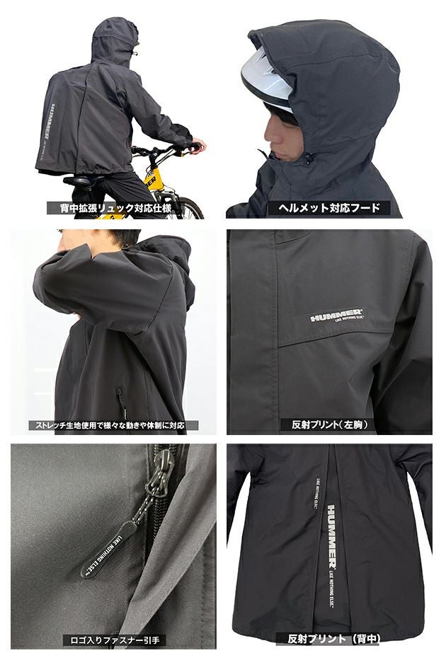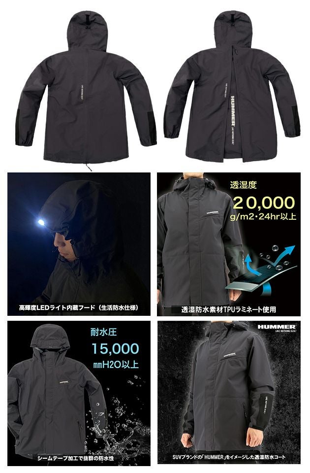 | 【特徴】 | フードには生活防水規格 IPX4 適合の高輝度LEDが搭載されており夜間のアクティビティをサポートします。 背中のファスナーを開く事でリュックを背負ったままでも着用できる『リュックインシステム』を採用。 ヘルメットの上からでも被れるフード形状で自転車やバイクのライディングにも対応します。 透湿性が高く湿気や汗も素早く発散させることで汗をかいてもムレずに常に快適な着心地を保ちます。 また、ストレッチ性があり、動きやすくライディングやトレッキングなどの体の動きにもスムーズに対応します。 生地表面はプレミアム耐久はっ水加工『Ei:コーティング』による驚異のはっ水性で水滴を素早く流れ落とします。 ◆重量:約525g(Lサイズ) ◆耐水圧:15,000mmH2O以上 ◆透湿:20,000g/㎡-24hr以上 ◆プレミアム耐久超はっ水加工『Ei:コーティング』(はっ水度:50洗/3級以上) ・高輝度LED内蔵フード(IPX4適合) ・ヘルメット対応型フード ・ファスナー開閉型リュック対応仕様 ・両サイド止水ファスナーポケット ・左袖部小物ポケット ・フード調節ドローコード+背面フラップ付き ・「LIKE NOTHING ELSE.」ロゴファスナー引き手 ・「HUMMER」ロゴ反射プリント(左胸・背中・左袖口) ・右腕刺繍ワッペン付き ・水の浸入を防ぐ袖口調節フラップ ※HM-W10は上着のみの商品となります。上下でご使用の場合はHM-W8 超はっ水透湿防水ストレッチパンツを別途お買い求めください。 |