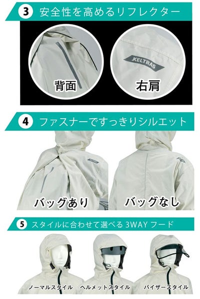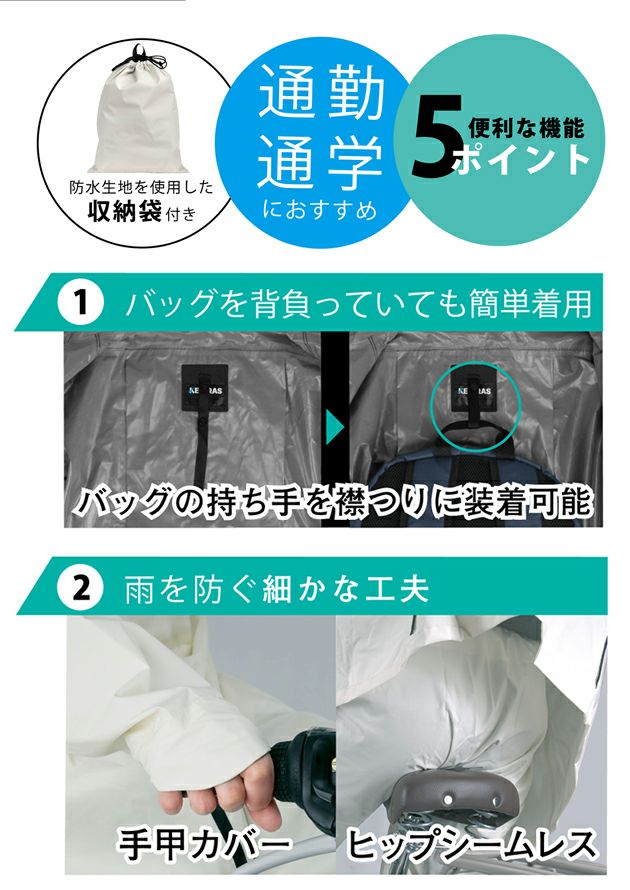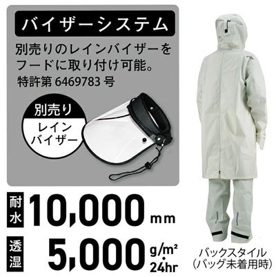 | 【特徴】 | バッグを背負ったまま着用できる 多機能ですっきりシルエットなレインスーツ ◆耐水圧10,000mm ◆透湿度5,000g/m2・24hr ◆バッグを背負っていても簡単着用 ◆バッグの持ち手を襟つりに装着可能 ◆ファスナーでスッキリシルエット ◆スタイルに合わせて選べる3WAYフード ◆防水生地を使用した収納袋付き ・手甲カバー ・三角布 ・背面、右肩リフレクター |