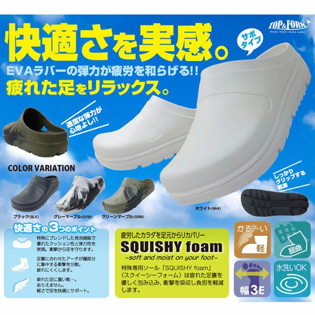 | 【特徴】 | 快適さを追求! 疲れた足をリラックス! EVAラバーの弾力が疲労を和らげるリカバリーサンダル! ◆疲れた足をリカバリー「スクイーシーフォーム」! 特殊なソール「スクイーシーフォーム」は疲れた足裏をやさしく包み込み、衝撃を吸収し負担を軽減します! ◆快適さの3つのポイント! 1、特殊にブレンドした発泡樹脂で優れたクッション性と弾力性を実現!衝撃から足を守ります! 2、足裏に合わせたアーチがかかと部分に集中する衝撃を分散!疲れにくくします! 3、疲れた足に重い靴…そんなのありえません!軽さで足を快適にサポート! ◆しっかりグリップする靴底! ◆適度な弾力が心地ヨシ! ◆水洗いOK ◆仕事終わりや休憩時間など、このサンダルで思いっきりリラックスしましょう! |