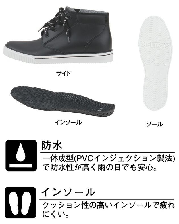 | 【特徴】 | 晴れの日も雨の日も毎日履きたいレインブーツ カジュアルライクで普段履きしやすく、急な雨でも安心 ◆一体成型(PVCインジェクション製法)で防水性が高く雨の日でも安心。 ◆クッション性の高いインソールで疲れにくい。 総丈:M、L(約12.5cm)LL、3L(約12.8cm)4L(約13cm) |