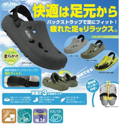 | 【特徴】 | 快適は足元から バックストラップで足にフィット!疲れた足をリラックス。 ここちよい柔らかさ ◆収納できる!調節可能なバックストラップで足にフィット。 ◆特殊にブレンドした発泡樹脂で優れたクッション性と弾力性を実現。衝撃から足を守ります。 ◆足裏に合わせたアーチが踵部分に集中する衝撃を分散。疲れにくくします。 ◆疲れた足に重い靴…。ありえません。軽さで足を快適にサポート。 |