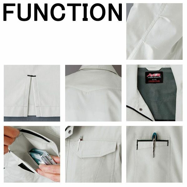 | 特徴 | 1、背当て付(メッシュ) 2、携帯電話収納ポケット 3、左胸ポケット(ペン差し付) 4、左袖ペン差し 5、肘タック 6、V字ヨーク 7、脇スリット 8、抗菌防臭 |