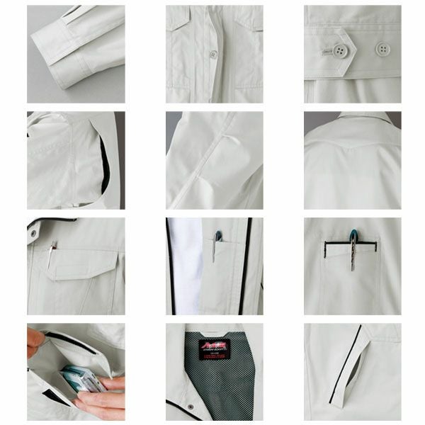 | 特徴 | 1、背当て付(メッシュ) 2、携帯電話収納ポケット 3、左胸ポケット(ペン差し付) 4、内側ペン差し 5、左袖ペン差し 6、肘タック 7、V字ヨーク 8、アクションプリーツ(メッシュ) 9、腰帯アジャスター 10、逆玉縁ポケット 11、スタンドカラー着用可能 12、前立て比翼仕様 13、袖カフス部分 14、抗菌防臭 |