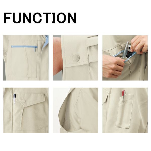 | 特徴 | 1、帯電防止素材使用 2、樹脂ボタン 3、ファスナー樹脂引き手金属 4、携帯電話収納ポケット 5、左胸ポケット(ペン差し付) 6、背中ベンチレーション 7、左袖ペン差し 8、右胸ファスナーポケット 9、オリジナルキャップボタン 10、背中メッシュ |