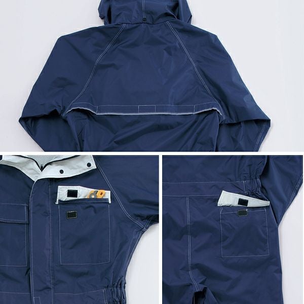1、防水 2、撥水加工 3、メッシュ 4、ベンチレション 5、リフレクター 6、収納フード 7、袖口調節 8、前開きパンツ 9、裾調節 | |