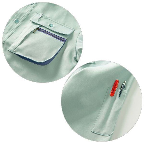 1、ソフト裏綿二重織 2、左胸ペン差し&Wポケット 3、左袖ペン差し 4、制電素材 5、ストレッチ素材 |