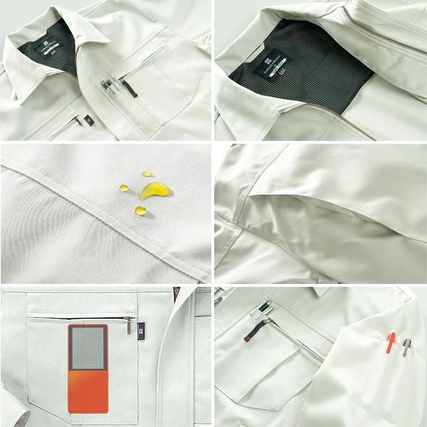 1、背当メッシュ 2、ノーフォーク 3、撥水撥油 4、左袖ペン差し 5、左胸ペン差し&スライダー付&左右胸ポケットファスナー隠し 6、ナノテックス・高度撥水撥油性 7、右胸内携帯ポケット 8、袖ダーツ2本 9、二層構造系 |