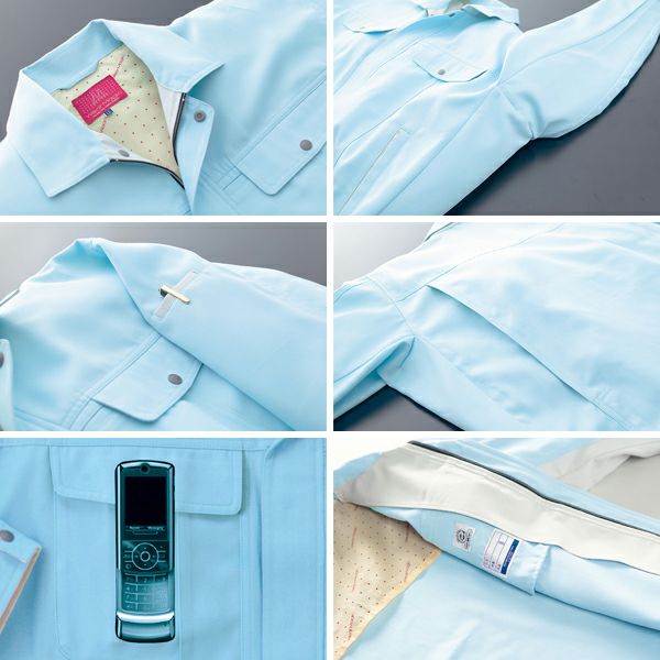 1、背当付 2、脇がつっばらない!!リラックスカット 3、ノーフォーク 4、右胸内携帯ポケット 5、左袖ペン差し 6、エコマーク・氏名片布 7、制電素材 8、リサイクル素材 9、ウェアマジック 交織ツイル |