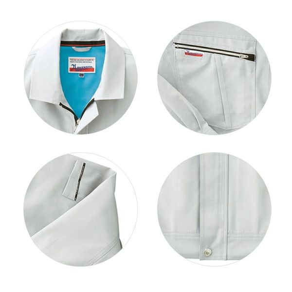 1、右胸携帯ポケット 2、左袖ペン差し 3、ノーフォークメッシュ 4、織ネーム(右胸) 5、衿消臭テープ&肩当メッシュ 6、脇消臭メッシュ 7、袖裹ダーツ2本 8、抗菌防臭 9、制電素材 |