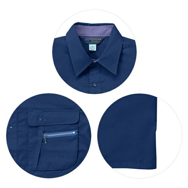 1、前立配色 2、左胸ペン差し・Wポケット 3、左右胸ポケットマチ付き 4、左袖ペン差し 5、防縮・防シワソフト加工 6、ストレッチ素材 7、抗菌防臭加工 8、液体アンモニア加工 |