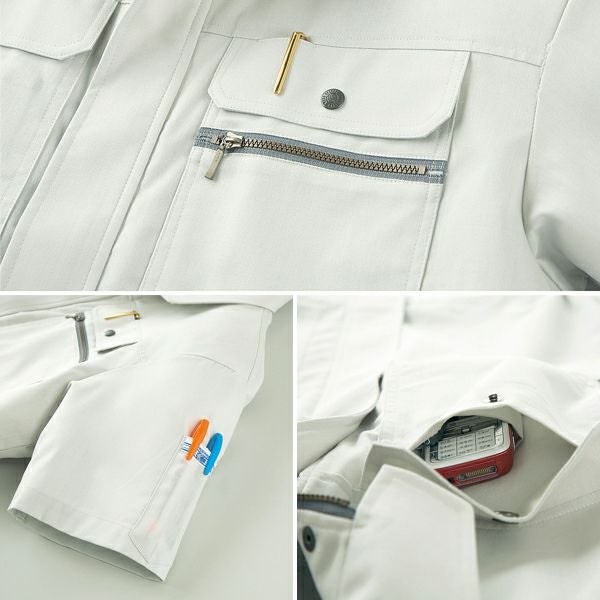 1、右胸携帯ポケット 2、左袖ペン差し 3、左胸ペン差し 4、形状記憶加工 5、衣服内気候アルザス 6、永続する防縮性 7、永続する防雛性 8、優れた柔軟性 9、優れた速乾性 10、優れた保型性 11、東洋紡ミラクルケア 12、快適サイエンス |