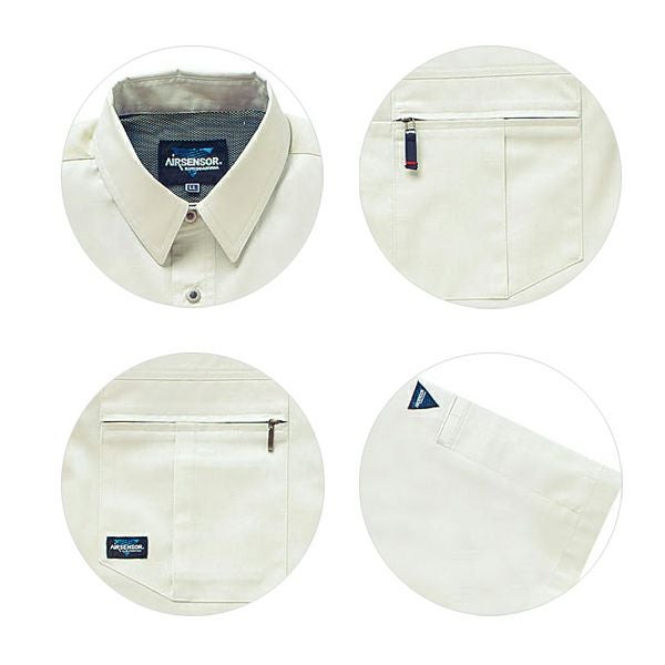 1、背当メッシュ 2、左袖Wペン差し 3、ノーフォークメッシュ 4、液体アンモニア加工 5、ナノリリース 6、通気性 7、撥油性が高く、汚れが落ちやすい |