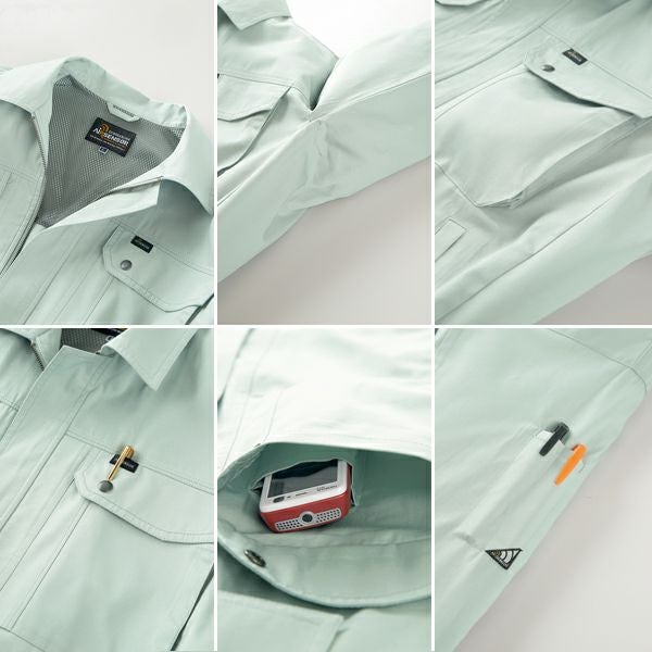 1、背裏メッシュ 2、右胸内携帯ポケット 3、胸ポケットマチ付(外側) 4、左袖ペン差し・織ネーム 5、左胸ペン差し 6、液体アンモニア加工 7、形態安定性 8、ソフト感 9、脇が突っ張らないリラックスカット採用。 |