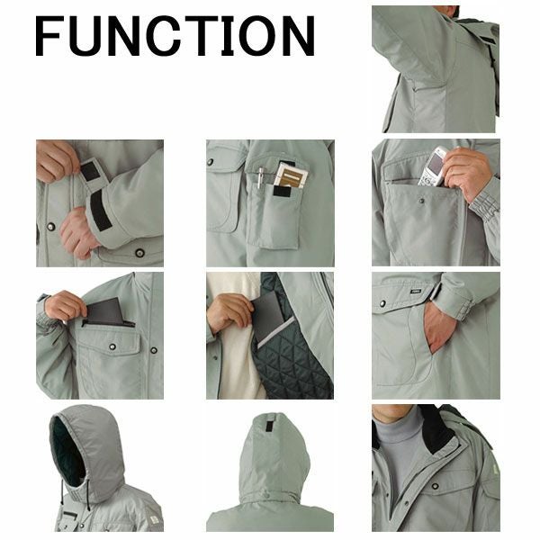 | 特徴 | 1、グリーン購入法適合商品 2、軽量防寒 3、撥水加工 4、フード取り外し(ヘルメット対応) 5、フード後ろマジックテープアジャスター 6、襟元ファスナーガード 7、右胸ファスナーポケット 8、携帯電話収納ポケット 9、左袖ペン差し&タバコ収納 10、特殊カッティングでスムーズな動き(XEカット) 11、内ポケット 12、袖口マジックテープ調節 13、ハンドウォーマー 14、樹脂ファスナー 15、樹脂ボタン(中側に金属) 16、再生キルト |