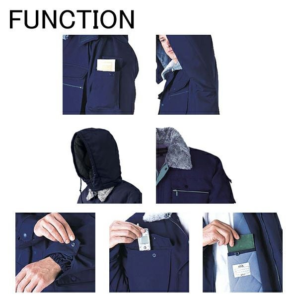 | 特徴 | 1、フード取り外し 2、衿ボア(着脱可能) 3、携帯電話収納ポケット 4、特殊カッティングでスムーズな動き(XEカット) 5、タバコ入れにも便利な袖ポケット 6、便利なポケット 7、風の侵入を防ぐ二重仕立て 8、撥水加工 9、樹脂ファスナー 10、樹脂ボタン |