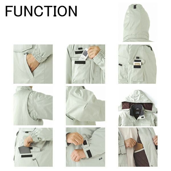 | 特徴 | 1、撥水加工 2、フード取り外し(ヘルメット対応) 3、フード後ろマジックテープアジャスター 4、ノーフォーク 5、左袖ペン差しタバコ収納 6、携帯電話収納ポケット 7、アクションタック 8、内ポケット 9、袖口マジックテープ調節 10、樹脂ファスナー 11、樹脂ボタン 12、ウエストフラップポケット 13、脇ポケット |
