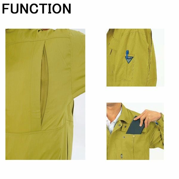 | 特徴 | 1、ソフト風合い 2、プリーツロン 3、防縮防シワ加工 4、帯電防止素材 5、メッシュプリーツロン採用 6、便利な胸ポケット付(深さ18cm) 7、袖ペン差し付。 8、金属ファスナー 9、金属ボタン |