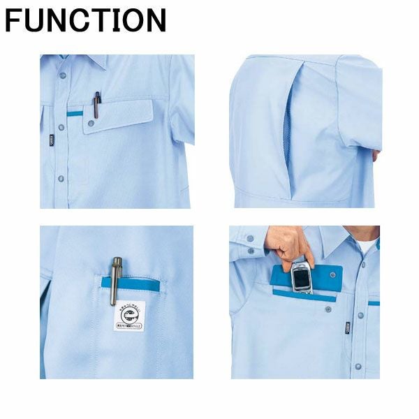 | 特徴 | 1、速乾性抜群 2、吸汗性抜群 3、帯電防止素材 4、リサイクル素材 5、樹脂ボタン 6、グリーン購入法適合商品 7、携帯電話収納ポケット付。 8、胸ペン差し付。 9、左袖ペン差し付。 10、ノーフォークメッシュ。 |