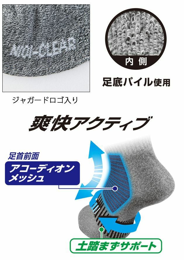 | 特徴 | 消臭物質を強力に化学結合して糸全体を改質し、足臭・汗臭の3大要因(イソ吉草酸・酢酸・アンモニア)を徹底分解消臭 消臭効果は【酸戻し】することで半永久的に持続します 消臭効果を『実感!』してください 【酸戻し】 ソックスを裏返し、水1リットルにお酢大さじ2杯を混ぜた液体に一晩浸せば消臭力が戻ります。 経年で消臭効果が薄まったと感じた際にお試しください。 ◆足首前面アコーディオンメッシュ ◆土踏まず部分サポーター付き ◆ジャガードロゴ入り ◆足底内側パイル素材 ◆スニーカー丈 |