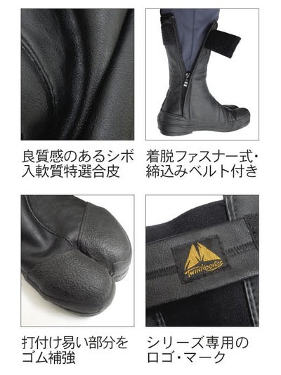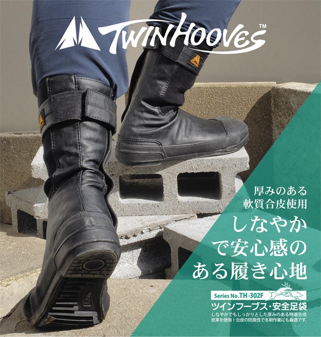 厚みのある軟質合皮仕様でしなやかで安心感のある履き心地 荘快堂 TH-302F 安全地下足袋 ツインフーブス安全足袋(合皮)