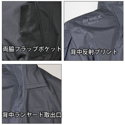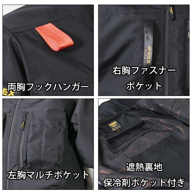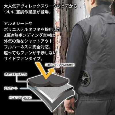 | 【特徴】 | ミリタリーブランド「アヴィレックス」から空調作業服登場! 見た目はもちろん、抜群の遮熱性で過酷な夏の現場を快適に。 フルハーネスにも対応するミリタリー空調作業着! ◆ポリエステル+アルミシート+ポリエステルの遮熱3層ボンディング生地を採用 ◆運転時など座ってもファンが干渉しないサイドファン仕様 ◆右袖ワッペン ◆両胸ランヤードフック ◆左胸マルチポケット ◆保冷剤ポケット付き ◆両脇フラップポケット ◆右胸ファスナーポケット ◆背中ランヤード取り付け口 ◆背中左肩反射プリント |