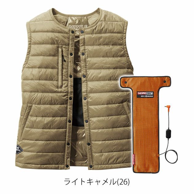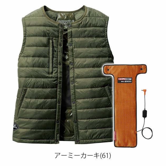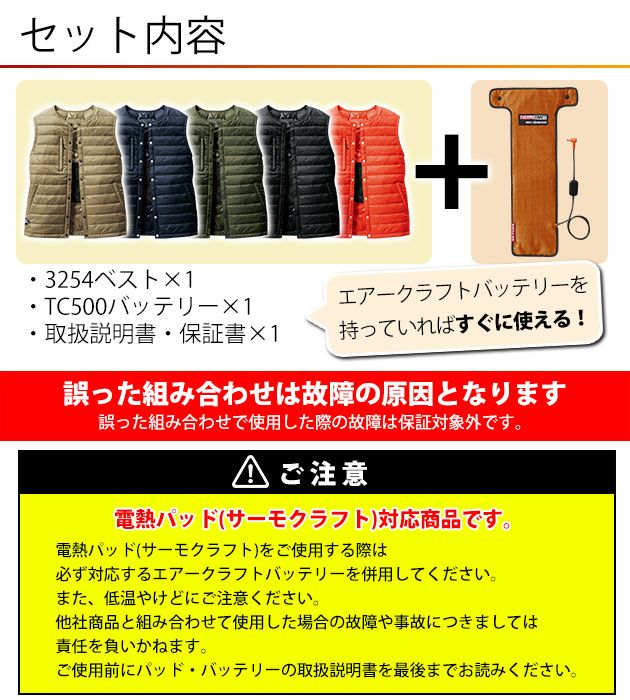 | 【ご注意】 | このベストはダウンベストと電熱パッドTC500がセットになっています。 他にエアークラフト(空調作業服)のバッテリーが必要です。 ◆TC500電熱パッドをご使用の際、バッテリーはAC08、AC360、AC300のいずれかを必ずご使用ください。 ◆他社製品と組み合わせて使用した際やサーモクラフトのパッドとバッテリーが対応していない組み合わせの場合は保証対象外です。 ◆ご使用前に必ず取扱説明書をお読みいただき正しくご使用ください。 ◆低温やけどにはご注意ください。 |