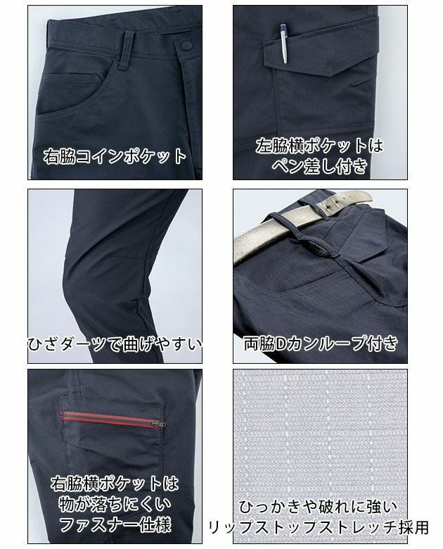 | 特徴 | ストレッチにJIS制電機能をプラス! 精密機器を扱う現場でも安心して着用できる男女ユニセックスモデル! ◆ひっかきや破れに強いリップストップ生地採用 ◆JIST8118帯電防止作業服適合 ◆左脇横ポケットはペン差し付き ◆右脇横ポケットはファスナー仕様 ◆ひざダーツで動きやすい ◆右脇コインポケット ◆両脇Dカンループ付き |