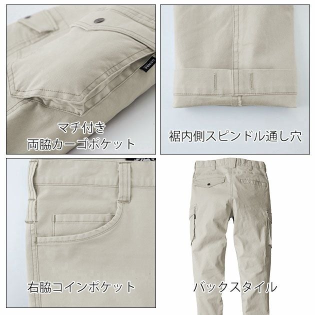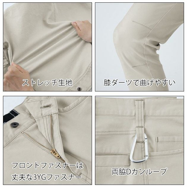 | 【特徴】 | 粗い加工を施した生地はユーズド感演出! ドビー織りならではの凹凸感でハードな見た目に。 さらにポリウレタンで抜群のストレッチを実現し、動きやすい作業服に。 ◆超伸びストレッチ ◆膝ダーツで動きやすい ◆フロントファスナーは丈夫な3YGファスナー ◆両脇Dカンループ付き ◆両脇フラップポケット・後ろマチ付きカーゴポケット ◆右脇コインポケット ◆裾内側スピンドル通し穴 |