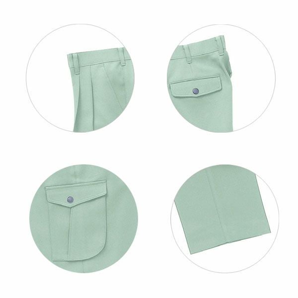 1、帯電防止素材 2、形態安定 3、裏綿 4、ストレッチ 5、カーゴポケットマチ部分配色 6、棒シック 7、右カーゴポケット内側 8、ファスナー/フロント:金属 9、ボタン/プラスチック |