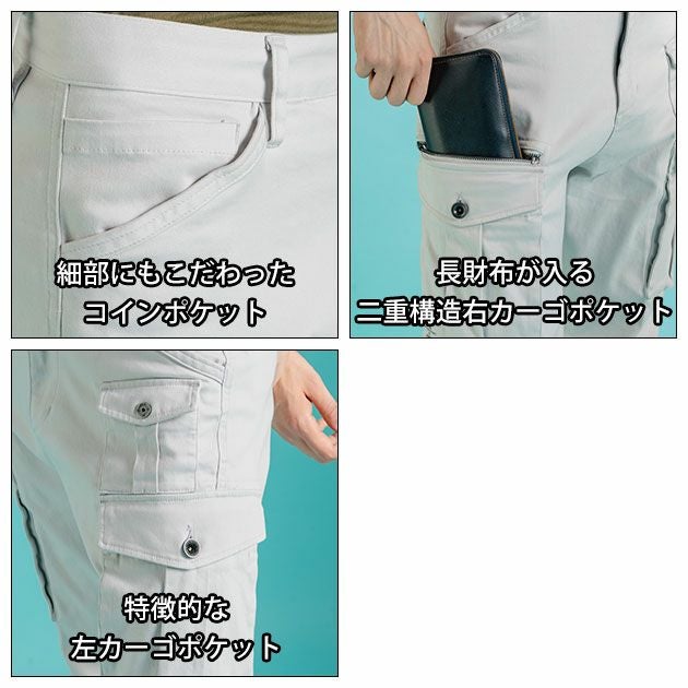 | 【特徴】 | 日本の職人魂を連綿と支え続けた伝統素材「綿」を再解釈。 鮮やかにアップデートを遂げた高級感あふれるコットンワークウェアが登場! 作業着の原点を見つめ直し、アップデートしたストレッチコットンワークウェア。 同等の厚みの生地と比較し、高密度な素材を採用することで、上質で高級感あふれる極上のルックスを実現。 ◆綿本来の強度を生かした一般基準約6倍の引裂き強度で耐久性を実現。 ◆抜群のストレッチ性を実現。 ◆ストレッチ性はもちろん、3Dカッティングにより更なる動きやすさを実現。 ◆収納性も高く、すべての面で高いパフォーマンスを発揮。 ◆特殊なリンスワンウォッシュ加工を施し、美しさとヴィンテージ感を両立した絶妙な見た目を実現。 ◆さりげなく、かつ効果的にデザイン性を高めるレタリングプリントで個人ユーザーはもちろん、企業などのチームユニフォームとしてもおすすめできる。 ◆細部にもこだわったコインポケット ◆長財布が入る二重構造の右側カーゴポケット ◆特徴的な左側カーゴポケット |