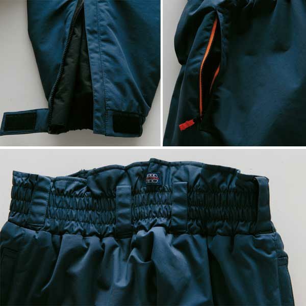 1、ハイバックカット 2、ファスナー付ポケット 3、裾アジャストファスナー