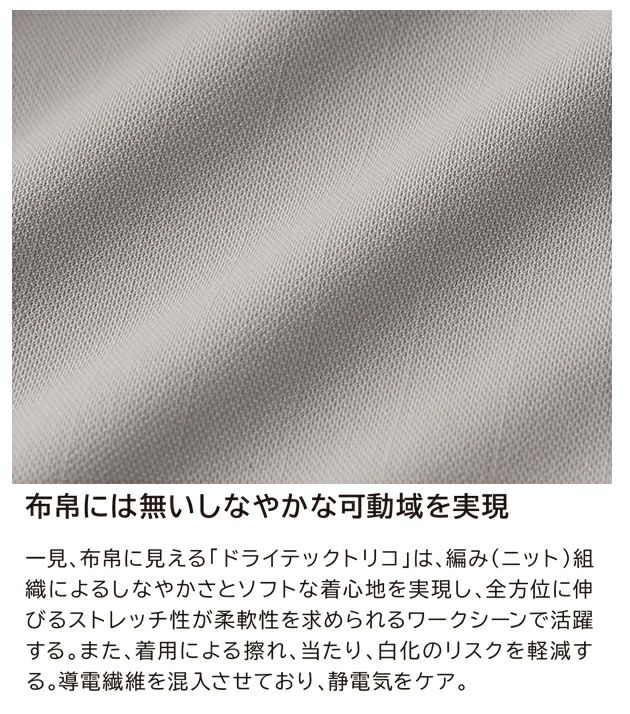 | 【特徴】 | JIS T8118規格適合の「静電気帯電防止作業服」 しなやかな質感、高機能素材を使用し長時間着ても疲れにくい柔軟性 ◆布帛には無いしなやかな可動域を実現 一見、布帛に見える「ドライテックトリコ」は、編み(ニット)組織によるしなやかさとソフトな着心地を実現し、全方位に伸びるストレッチ性が柔軟性を求められるワークシーンで活躍する。 また、着用による擦れ、当たり、白化のリスクを軽減する。導電繊維を混入させており、静電気をケア。 ◆360度反射機能 夜間や暗がりでの視認性を高める為、反射パーツ、反射ロゴでどこから見ても反射する仕様になっている。 ・パンツ脇ゴム仕様 ・縦方向10%、横方向20%のストレッチ性 ・ベタつきを軽減するドライな編み組織 ・ポケット底二重補強 ・付属類は全て樹脂製を使用 ・玉縁ポケット |