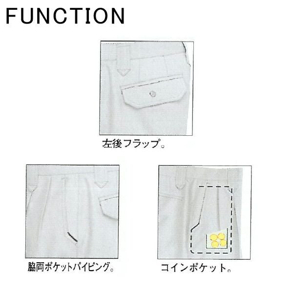 | 特徴 | 1、XEカット 2、ストレッチ 3、スムーズアップ 4、帯電防止 5、年間対応 6、左後フラップ 7、脇ポケットパイピング 8、コインポケット |