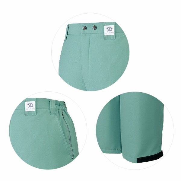1、オリジナルデザインボタン 2、エコマーク 3、膝上裏地 4、テングダブルドット釦 5、サイドスルーポケット 6、裾口フリーマジック 7、新型ループ 8、撥水加工 9、製品制電 10、エコ |