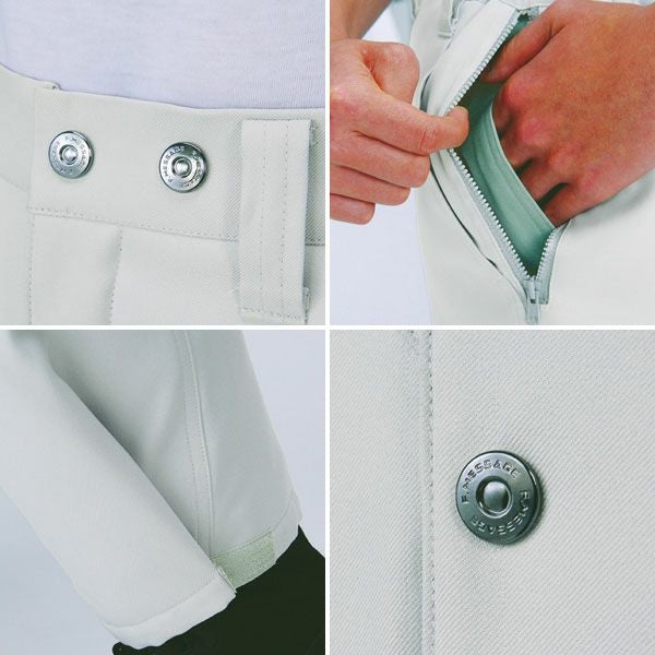 1、ワンポイント 2、オリジナルデザインボタン 3、テングダブルドット釦 4、サイドスルーポケット 5、裾口フリーマジック 6、帯電防止素材使用 7、撥水加工 |