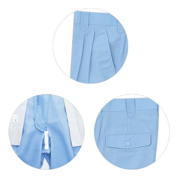 1、男女兼用 2、低発塵 3、帯電防止素材 4、形態安定 5、ファスナー/フロント:金属 6、ボタン/プラスチック 7、氏名片布付 8、エコマーク付(右後) 9、棒シック |