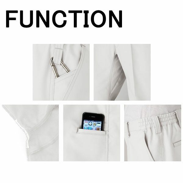 | 特徴 | 1、カラビナループ付 2、着楽カット 3、マルチポケット 4、男女兼用 5、JIS帯電防止規格合格 6、帯電防止素材使用 7、ストレッチ |