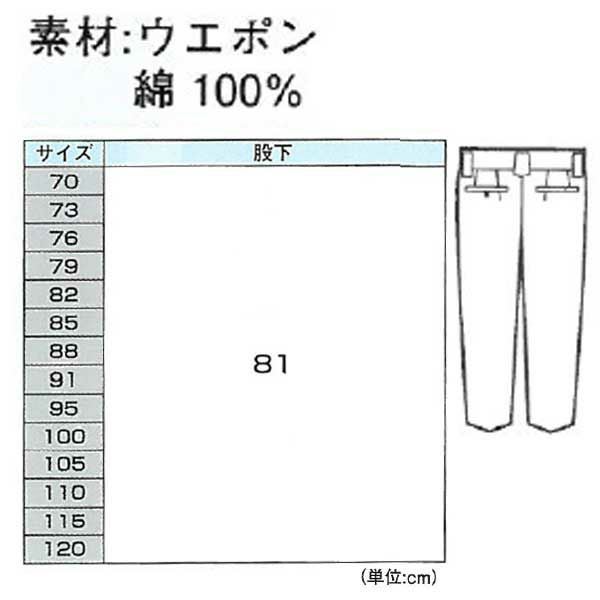 | 適応サイズ表(cm) | サイズ | 70 | 73 | 76 | 79 | 82 | 85 | 88 | 91 | 95 | 100 | 105 | 110 | 115 | 120 | 股下 | 81 |