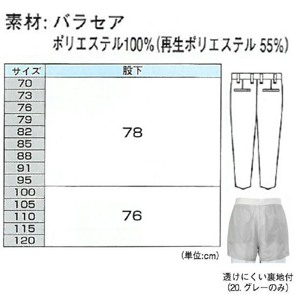 | 適応サイズ表(cm) | サイズ | 70 | 73 | 76 | 79 | 82 | 85 | 88 | 91 | 95 | 100 | 105 | 110 | 115 | 120 | 股下 | 80 |