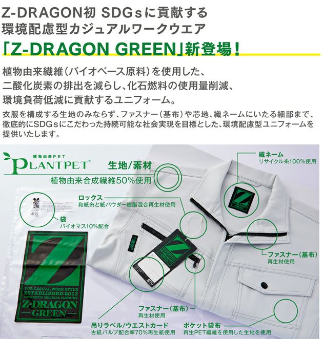 | 【特徴】 | Z-DRAGON初SDGsに貢献する環境配慮型カジュアルワークウェア「Z-DRAGON GREEN」新登場! 植物由来繊維(バイオベース原料)を使用した、二酸化炭素の排出を減らし、化石燃料の使用量削減、環境負荷低減に貢献するユニフォーム ◆エコマーク認定商品 ◆グリーン購入法判断基準対応 ◆JIS T-8118規格適合帯電防止服 ・コインポケット ・股ガゼット ・ワンポイント ・カラビナループ ・消臭&抗菌テープ ・エコマーク |