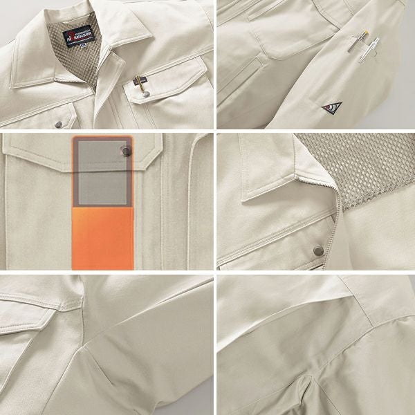 1、脇がつっぱらない!リラックスカット 2、背当メッシュ 3、左胸ペン差し 4、右胸内携帯ポケット 5、ノーフォーク 6、左袖ペン差し 7、綿100% 8、防縮防シワ加工・ソフトツイル 9、液体アンモニア加工 |