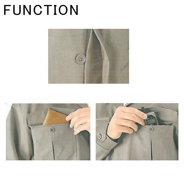 | 特徴 | 1、樹脂ボタン 2、便利なマルチポケット(右胸) 3、携帯電話収納ポケット付(左胸) 4、比翼前立 |